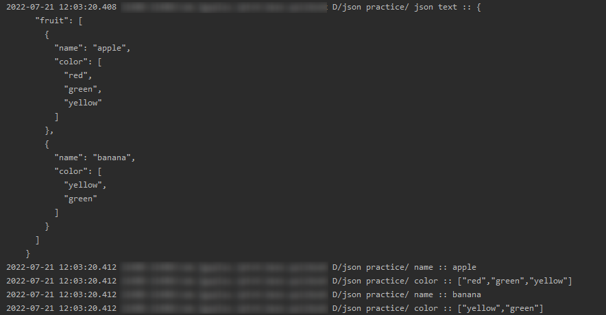 Log.d("json practice/ color : ",fruitItem.getColor()[i]);