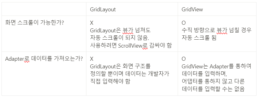 GridView는 LinearLayout과 RelativeLayout 등 다른 레이아웃들의 정렬과 성능문제를 보완하기 위해 만들어졌습니다.